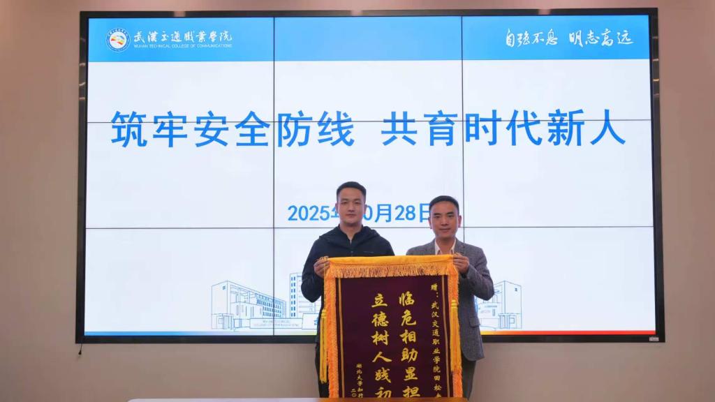 湖北大学知行学院副校长刘张虎一行专程来到我校,将一面绣有“临危相助显担当,立德树人践初心”的锦旗和一封表扬信,送给田松老师手中,以表彰他在危急时刻跨校联动,成功挽救一名学生生命的感人事迹。