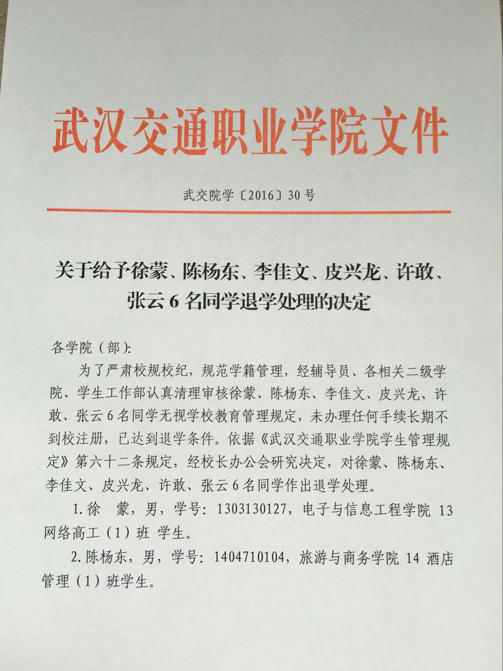 关于给予徐蒙、陈杨东、李佳文、皮兴龙、许敢、张云6名同学退学处理的决定
