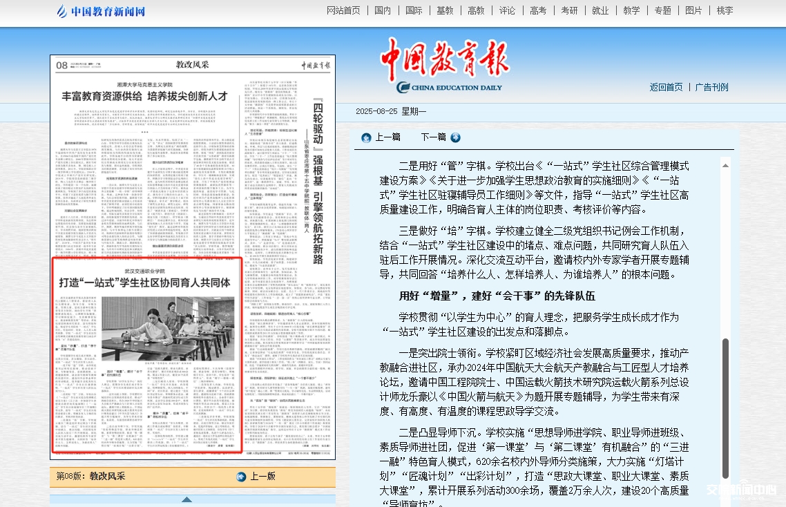 武汉交通职业学院认真落实新时代立德树人工程要求,抓好育人队伍关键要素,领导力量、导师力量、管理力量、思政力量和后勤力量等多方协同,面向学生开展“思想解惑促成长、心理解压促健康、学习解困促提升、生活解难促信心、就业解忧促发展”等活动,系统化建设体现时代要求、富有校院特色、贴近学生实际的“一站式”学生社区,打造时时、处处、人人育人的共同体。学校“一站式”学生社区综合管理模式被湖北省教育部门动态评级为“A”类建设高校。