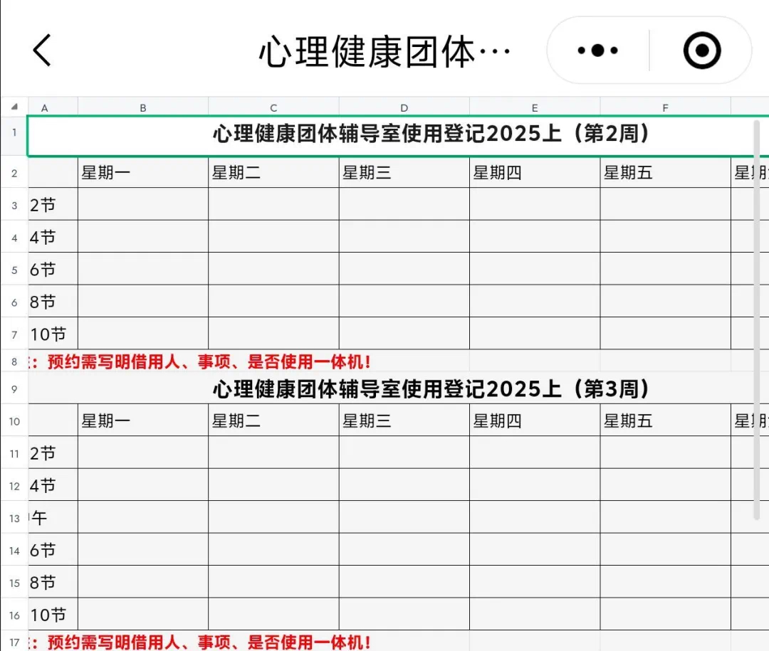 步骤四:根据活动安排选择空闲的时间段,在团辅室(心理健康中心场地)使用登记表格上填上借用人,事项,是否使用一体机等信息。