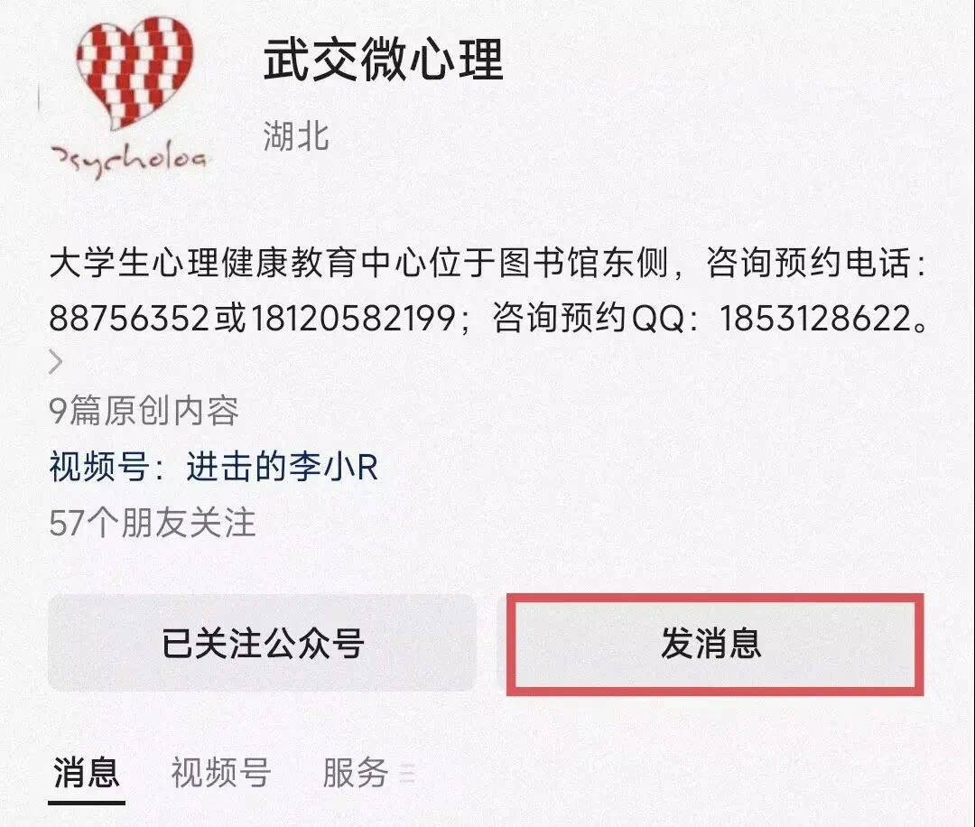 步骤一:打开微信搜索并关注武交微心理公众号,然后点击“发信息”。