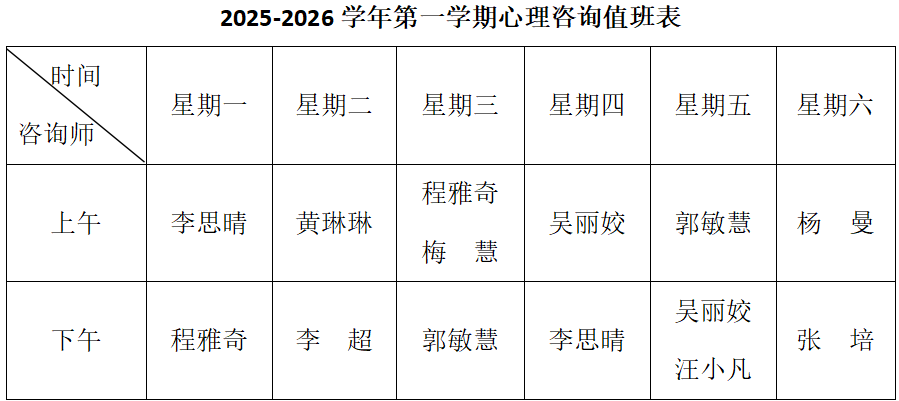 4.咨询师值班表如有变更,中心会及时通知,请关注“武交微心理”微信公众号。